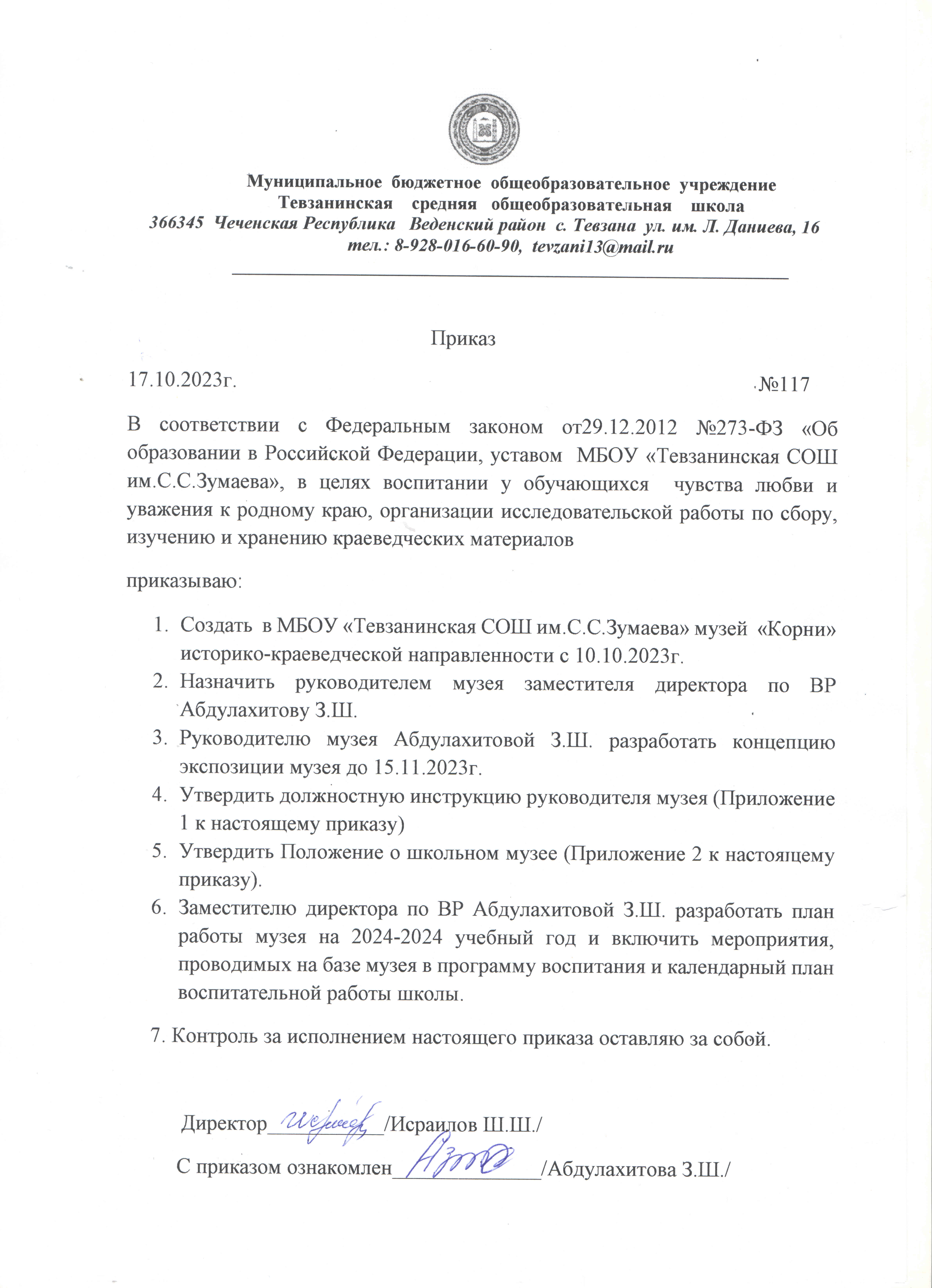 Приказ №117 от 17.10.2023 "О создании школьного музея "Корни" историко-краеведческой направленности
